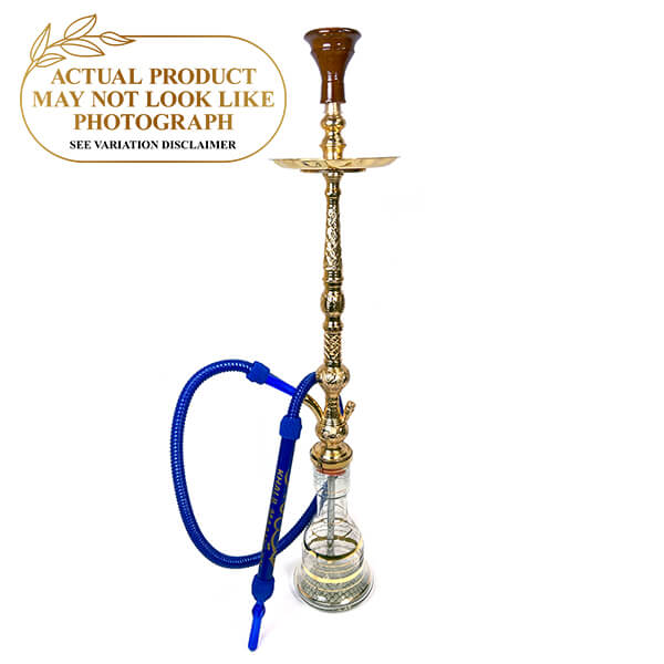 The Syrian Prince is the newest Khalil Mamoon hookah and has a very exotic appeal. The Khalil Mamoon company is known to build premium quality hookahs. The stem on this hookah has unique accents and the glass base is the KM Jumbo base which is very highly sought after. The stem is a very very heavy and solidly built. The hookah comes in 36in size. The KM hookah also comes with a premium KM hose, tongs, and Egyptian clay bowl.